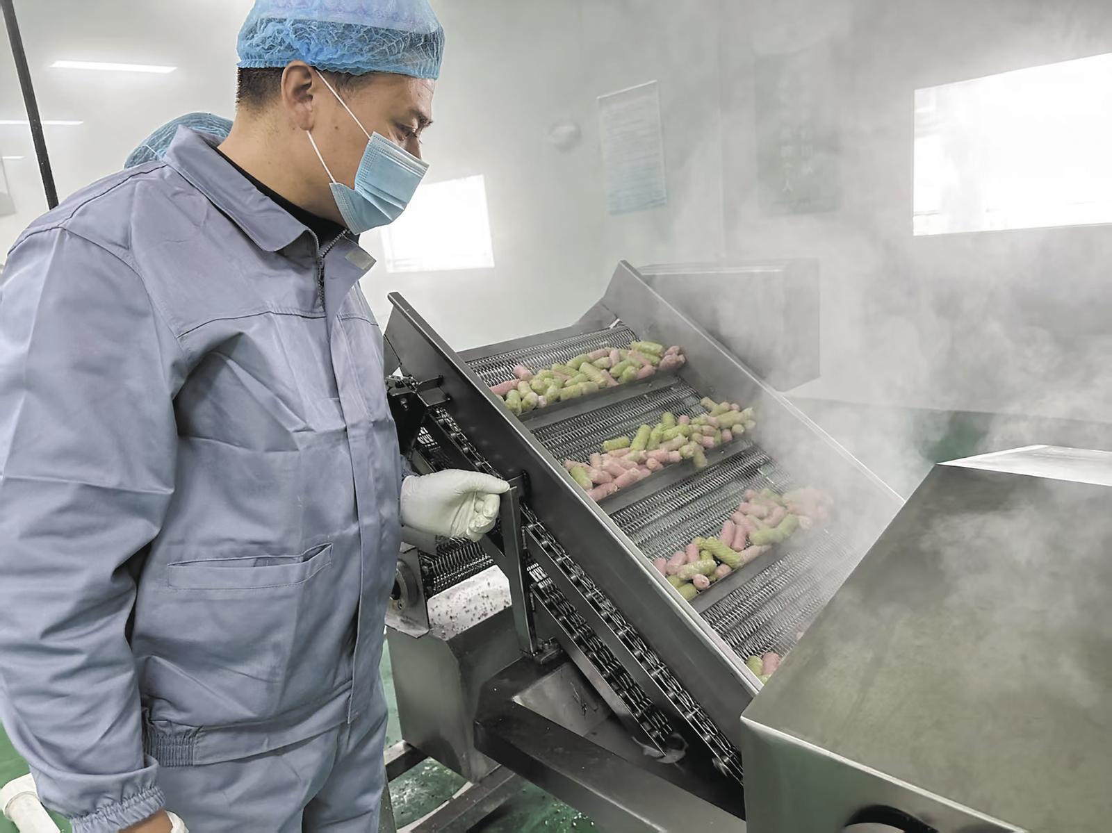 在氤氲热气中,数名工人身着白色工装、头戴防尘帽,有人手持量杯精准调配馅料,有人目不转睛盯着成型机的运行,还有人熟练地将冷却后的肉丸分拣包装。在这里,默契的配合早已成为常态,团结和谐的情谊融入每一道生产工序,转化为推动产业发展的强大合力。