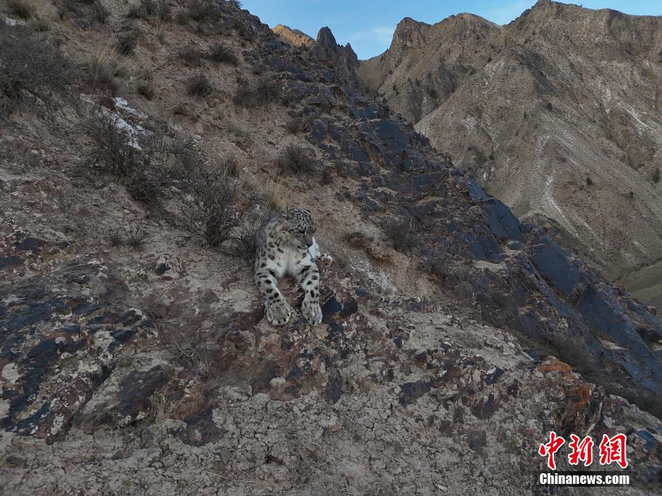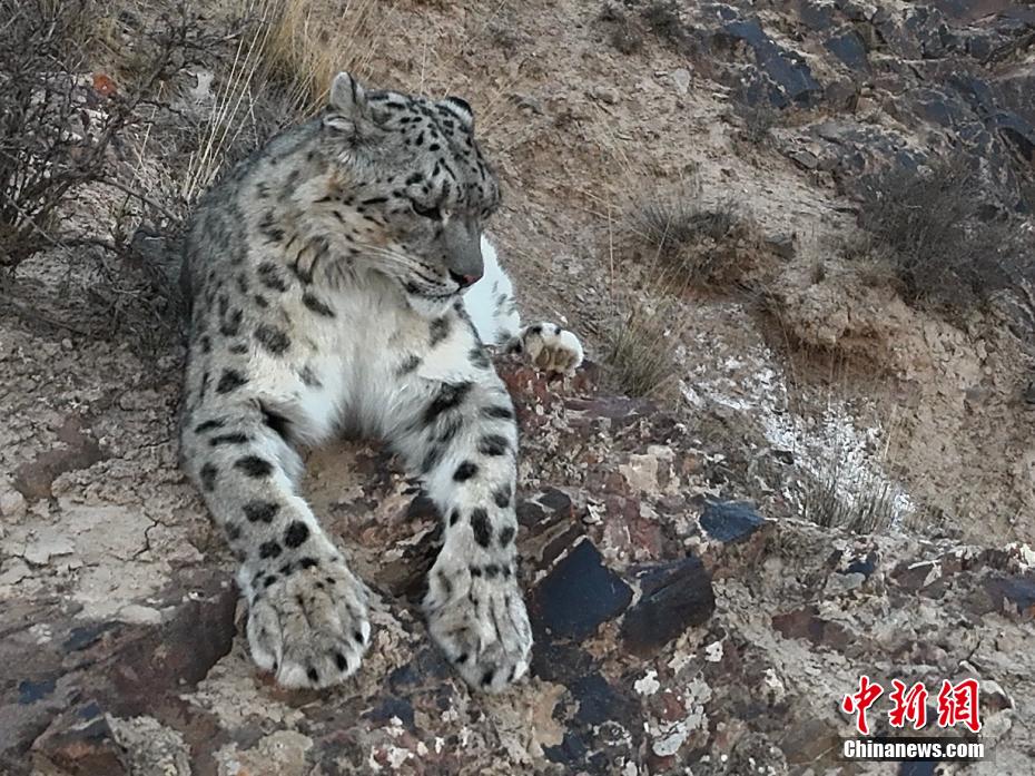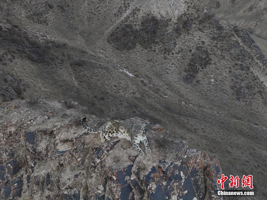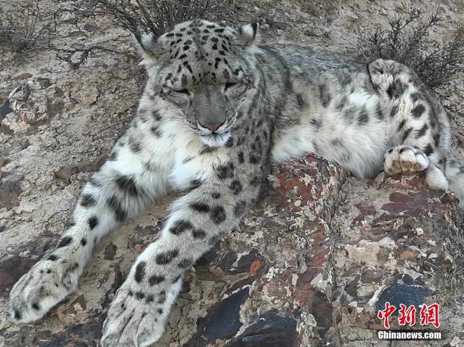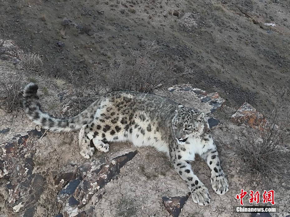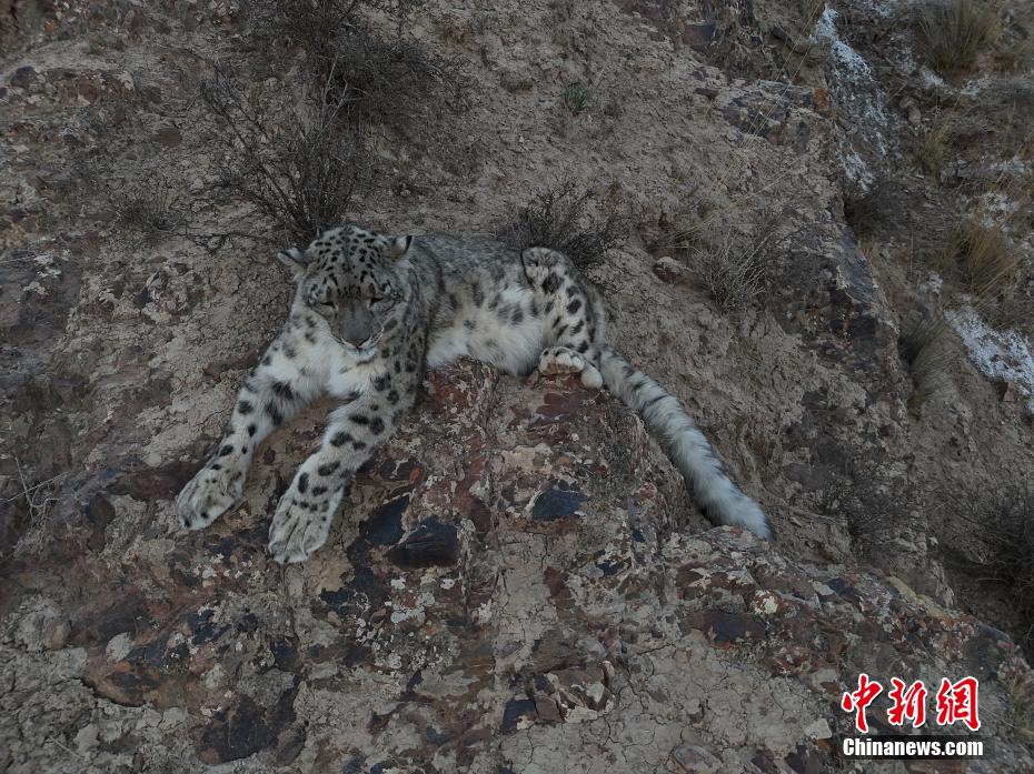 青海省海西蒙古族藏族自治州都兰县委宣传部3日消息,该县牧民旦知尖措5月1日在热水乡放牧时,用无人机近距离拍摄到国家一级保护动物雪豹休憩的珍贵影像。(无人机照片)旦知尖措 摄