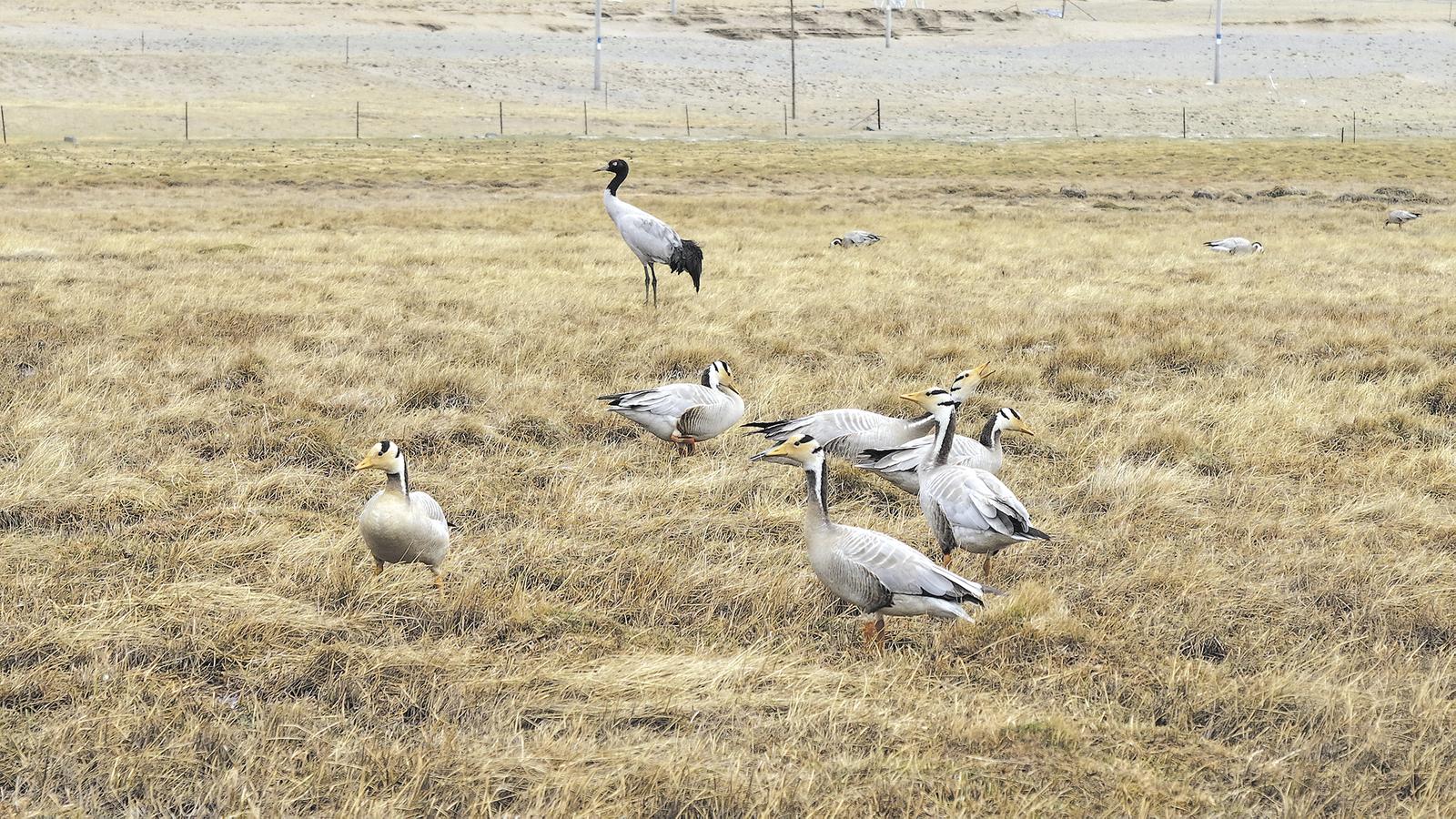 “今天,黑颈鹤去河边了,斑头雁和赤麻鸭还在湿地。”