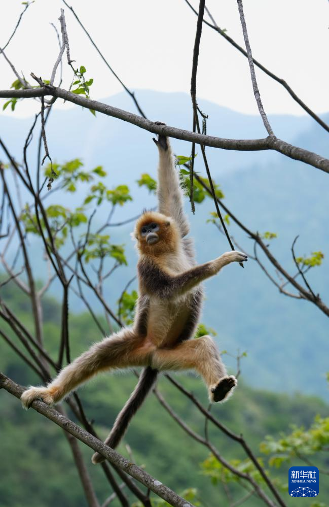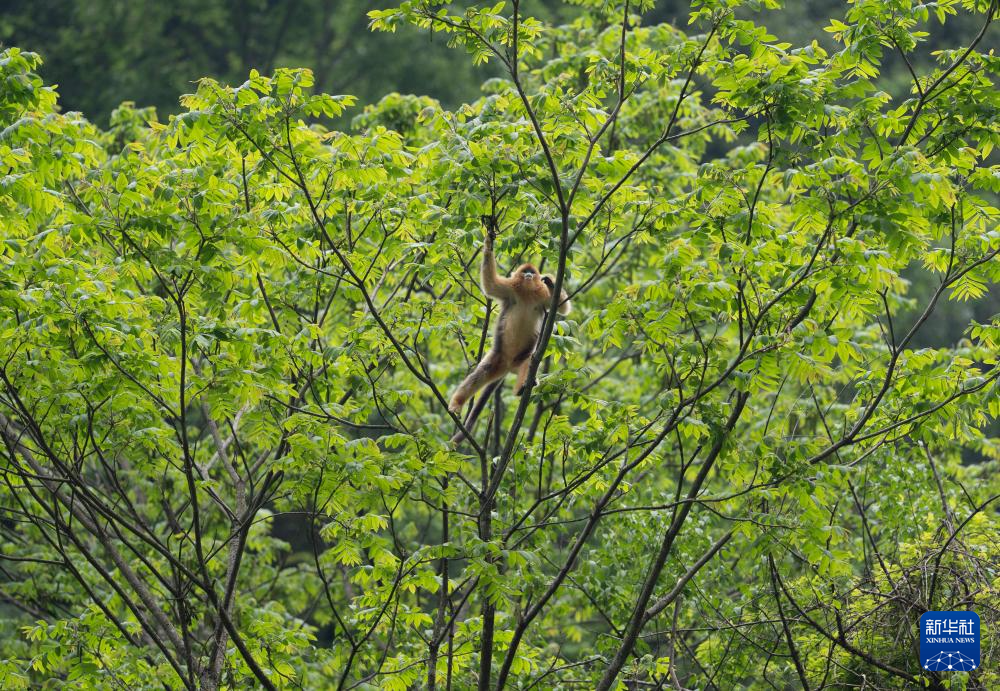一只小金丝猴在密林中跳跃(5月21日摄)。新华社记者 江宏景 摄