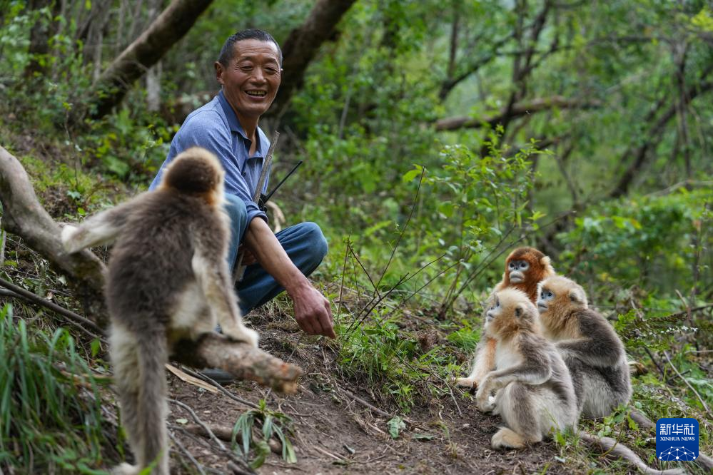 在四川平武川金丝猴科普自然教育基地里,长期与金丝猴打交道的巡护员徐庭友成为川金丝猴的“朋友”(5月21日摄)。新华社记者 江宏景 摄