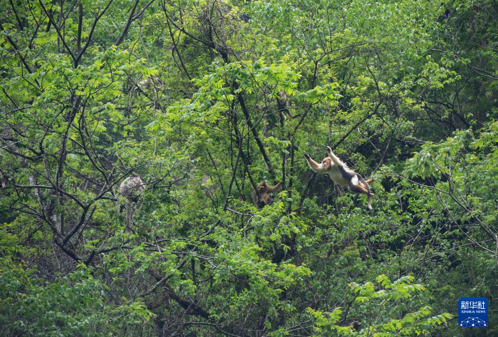 一只成年金丝猴在密林中跳跃(5月21日摄)。新华社记者 江宏景 摄