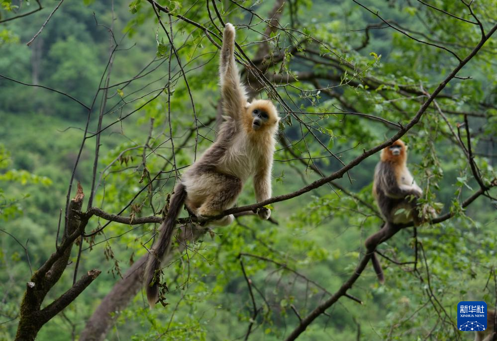 两只金丝猴在密林中打闹(5月21日摄)。新华社记者 江宏景 摄