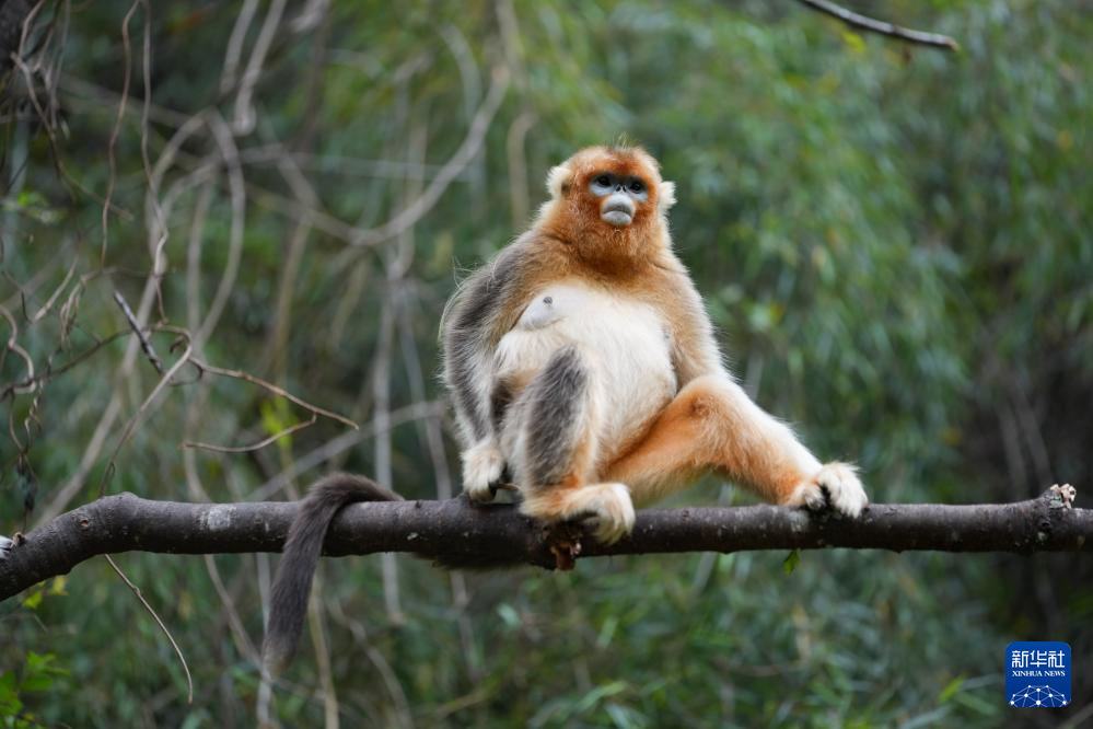 一只金丝猴端坐在密林的树枝上眺望(5月21日摄)。新华社记者 江宏景 摄