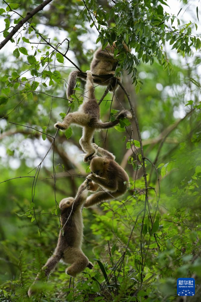 几只小金丝猴在密林中嬉戏(5月21日摄)。新华社记者 江宏景 摄