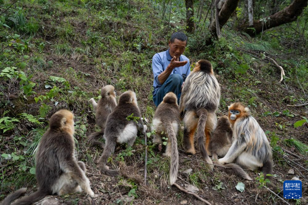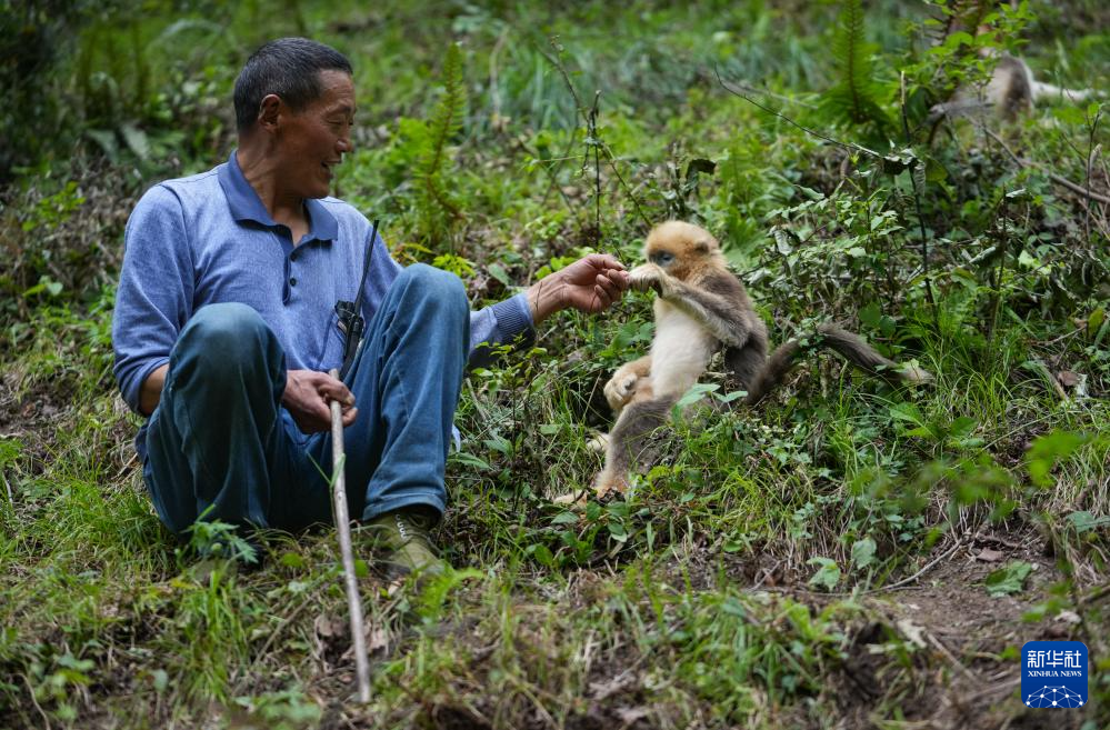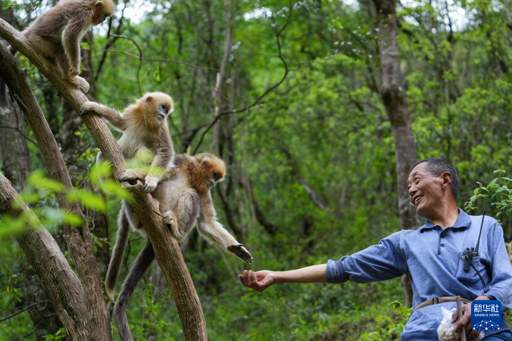 在平武川金丝猴科普自然教育基地,长期与金丝猴打交道的巡护员徐庭友与川金丝猴互动(5月21日摄)。新华社记者 江宏景 摄