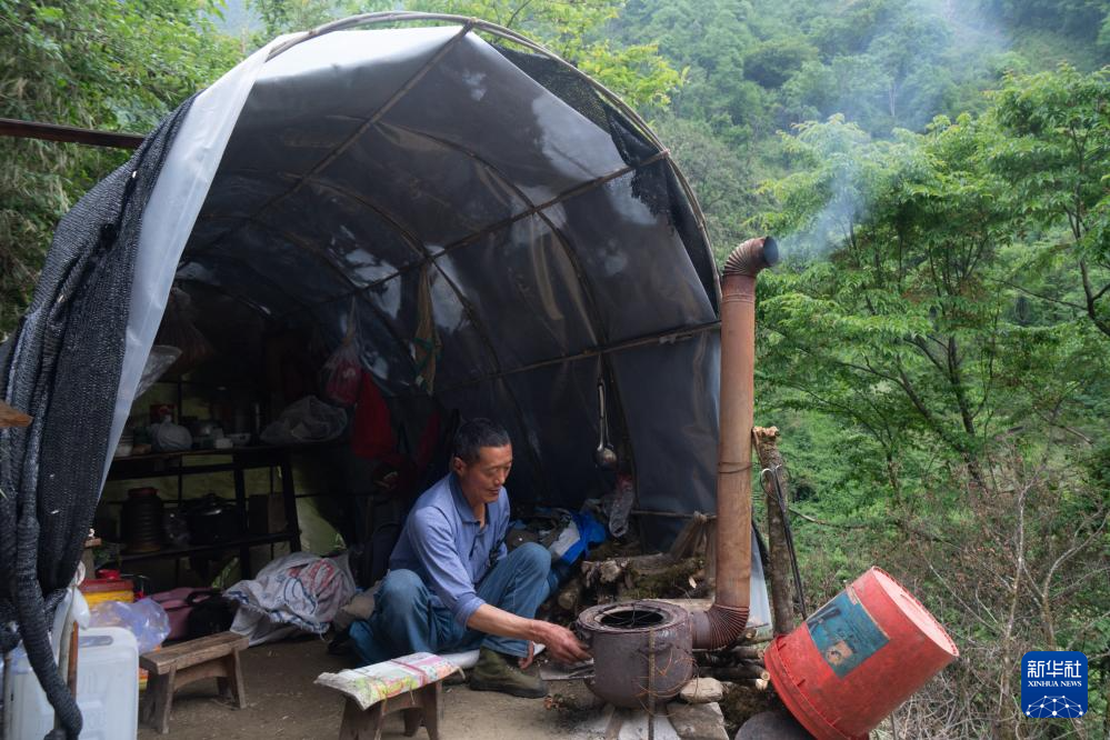 巡护员徐庭友在简易窝棚里生火做饭(5月21日摄)。新华社记者 江宏景 摄