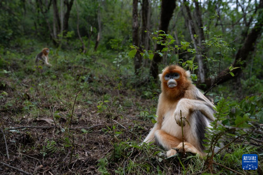 在平武川金丝猴科普自然教育基地里,一只川金丝猴眺望远方(5月21日摄)。新华社记者 江宏景 摄
