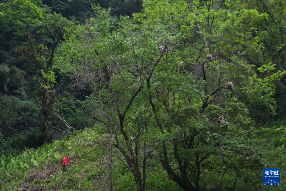 在平武川金丝猴科普自然教育基地里,巡护员田龙平观察川金丝猴的活动情况(5月21日摄)。新华社记者 江宏景 摄