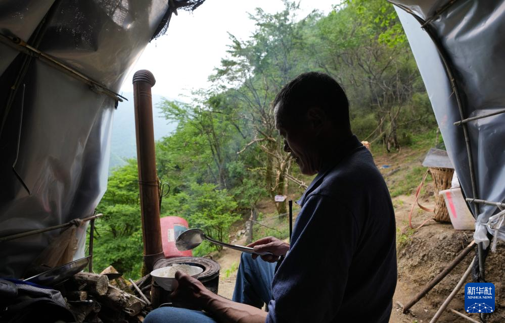 巡护员徐庭友在简易窝棚里吃饭(5月21日摄)。新华社记者 江宏景 摄