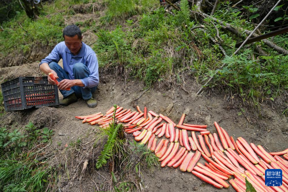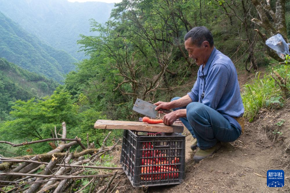 在平武川金丝猴科普自然教育基地里,巡护员徐庭友为川金丝猴准备食物(5月21日摄)。新华社记者 江宏景 摄