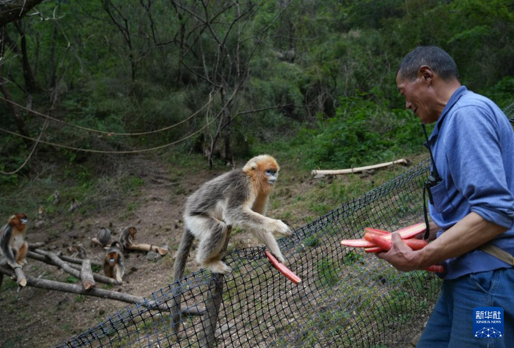在平武川金丝猴科普自然教育基地里,巡护员徐庭友给川金丝猴投食(5月21日摄)。新华社记者 江宏景 摄