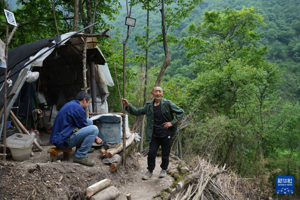 巡护员杨金良(右)和王德友在山间休息(5月21日摄)。新华社记者 江宏景 摄