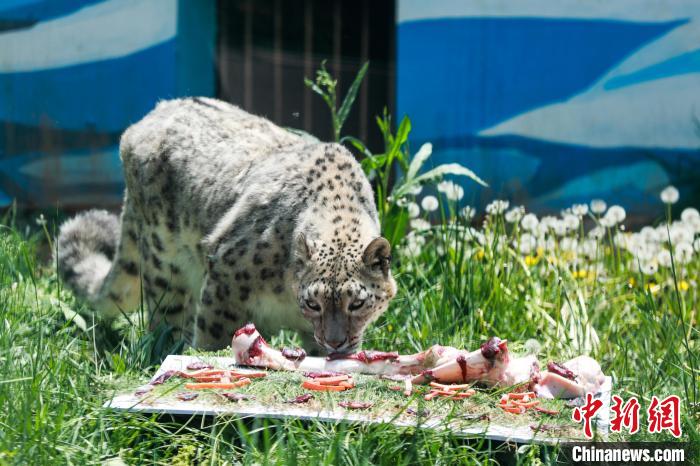 “傲雪”生日当天,西宁植物园(青海野生动物救护繁育中心)的饲养员为它定制了特别的棒骨“生日蛋糕”,以鲜嫩肉片和营养棒骨为主料,用胡萝卜精心拼出“生日快乐”字样,既是美味盛宴,也趣味满满。