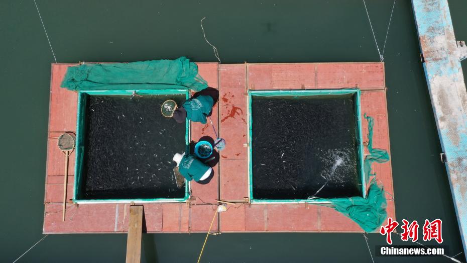 图为工作人员检查裸鲤鱼苗。(无人机照片)张忠苹 摄
