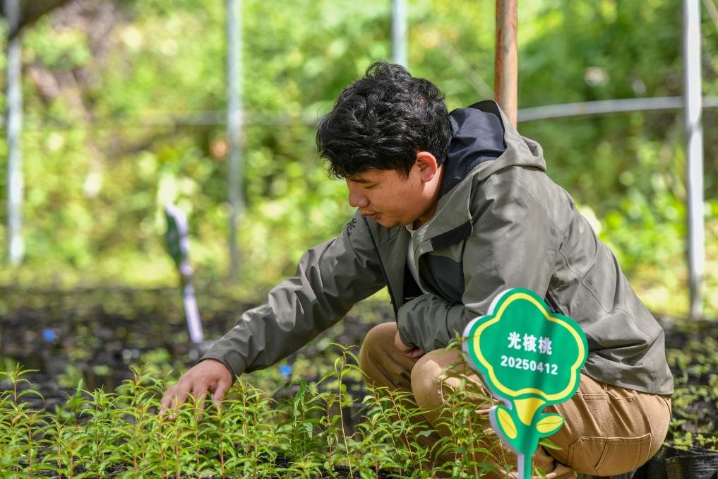 6月15日,保护区工作人员在救助站内查看滇金丝猴食源性植物育苗生长状况。