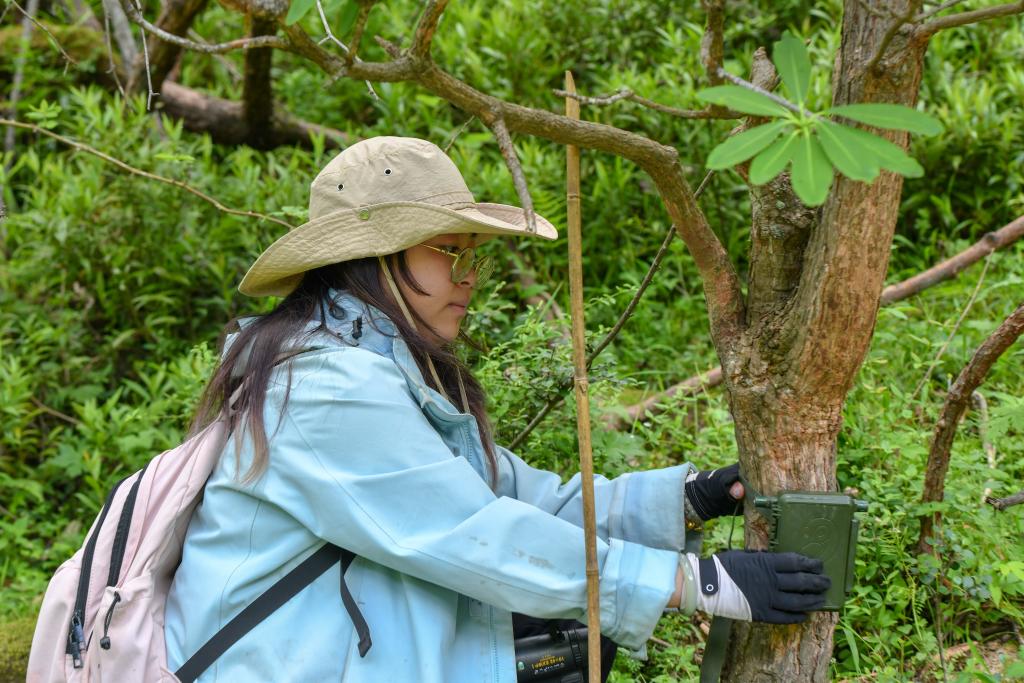 6月15日,西华师范大学研究生在保护区内安装用于记录声音的鸣声记录仪。