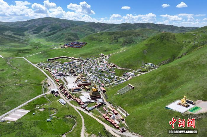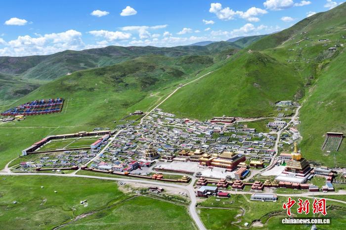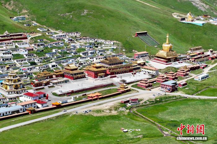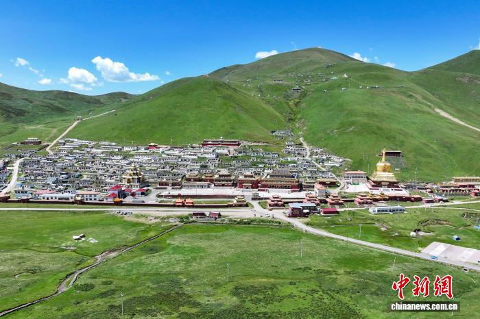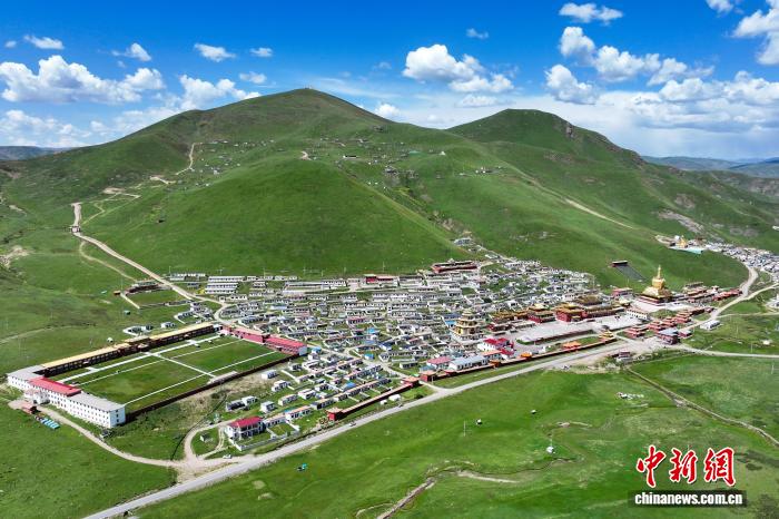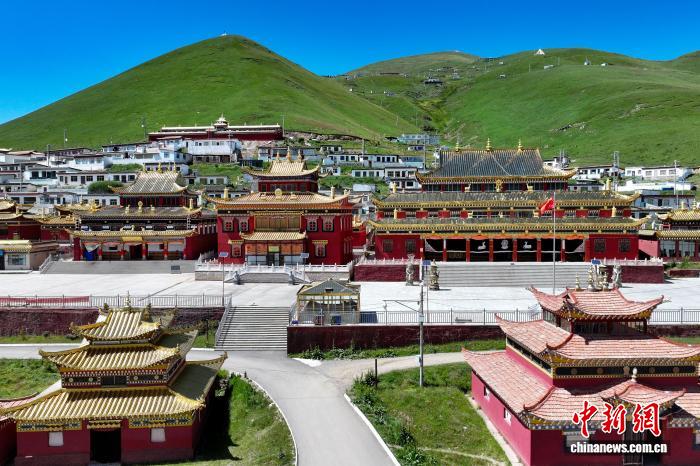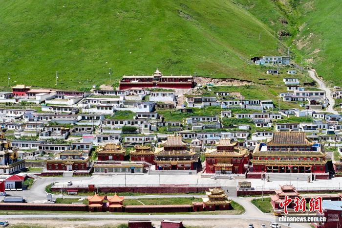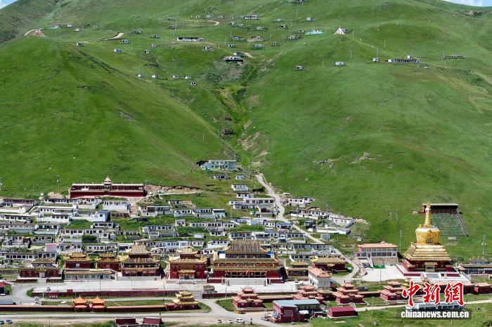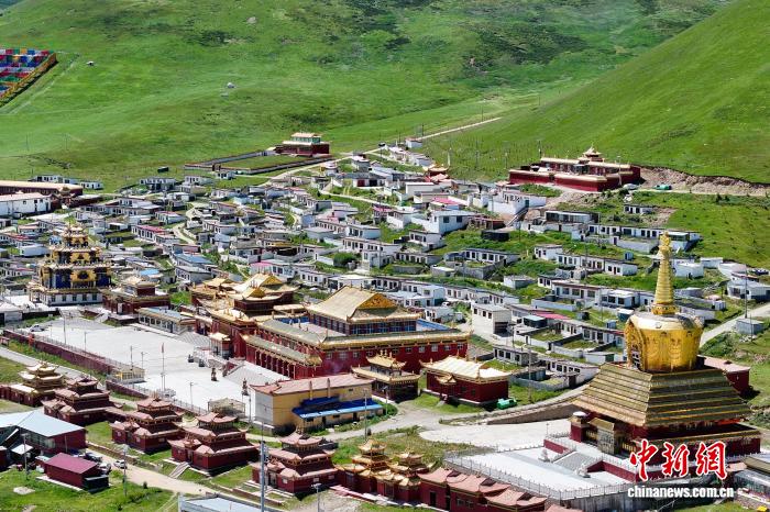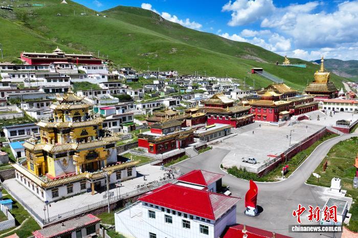 8月16日,航拍位于青海省果洛藏族自治州达日县境内的查朗寺。中新社记者 薛蒂 摄
