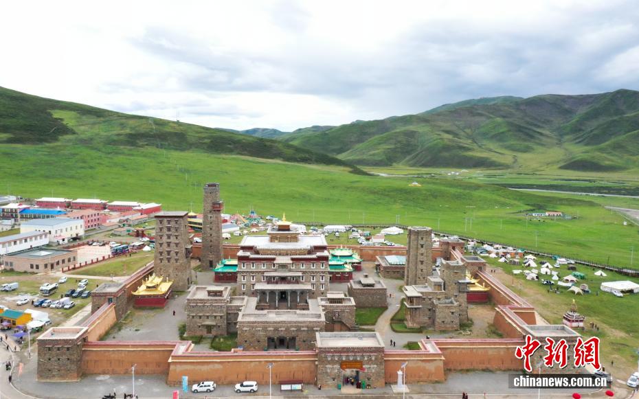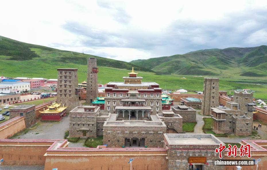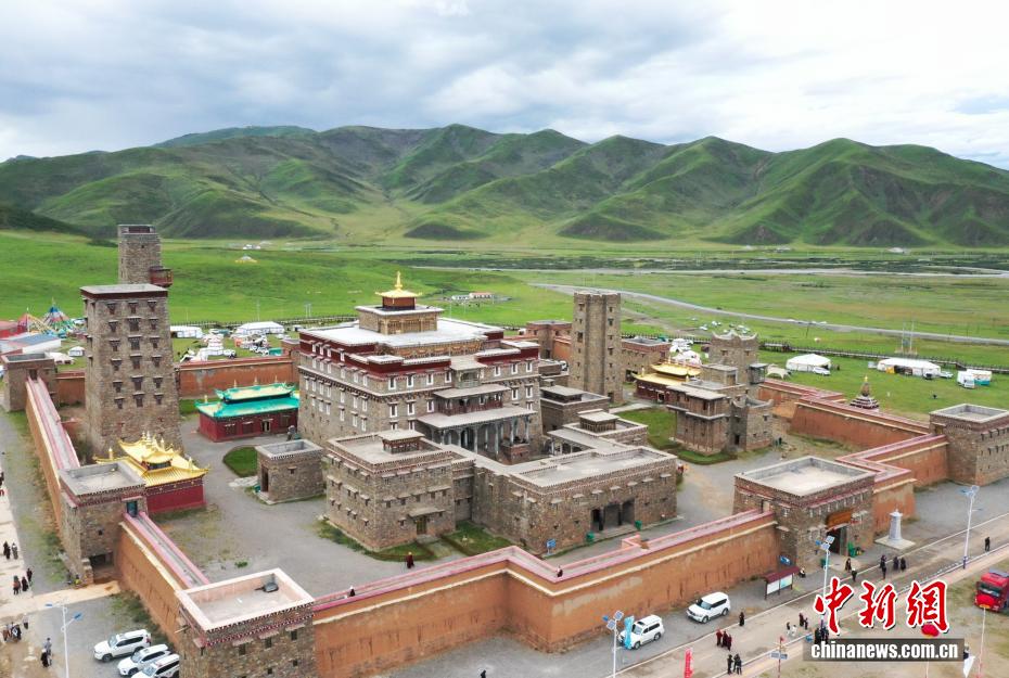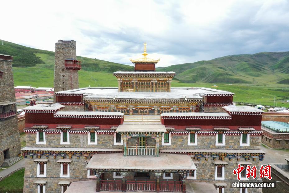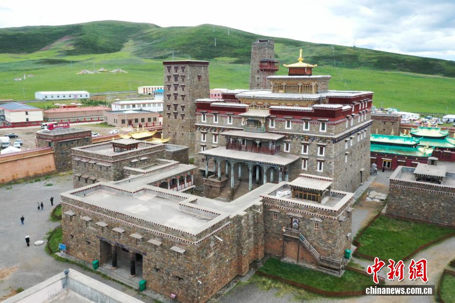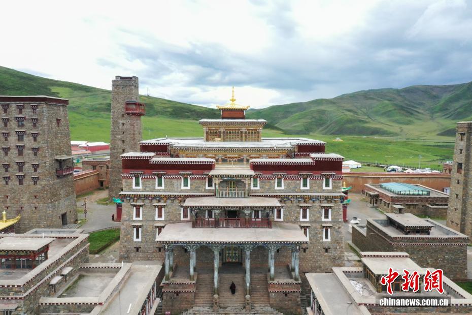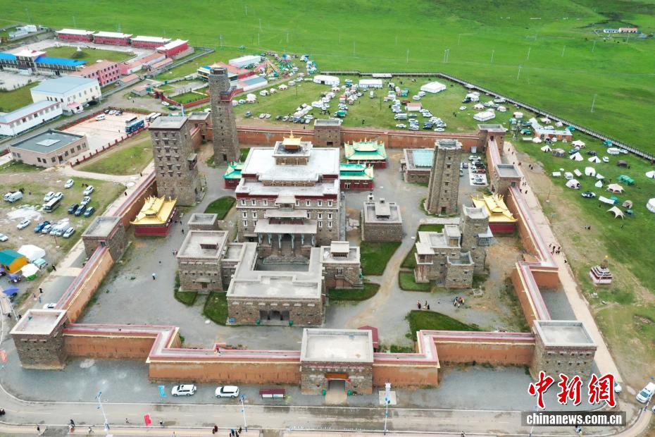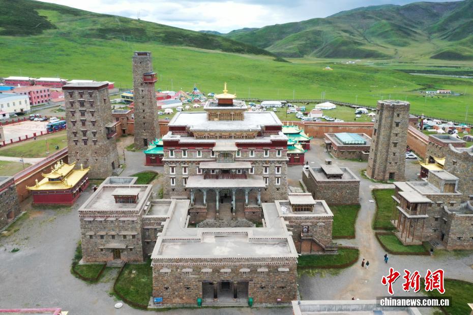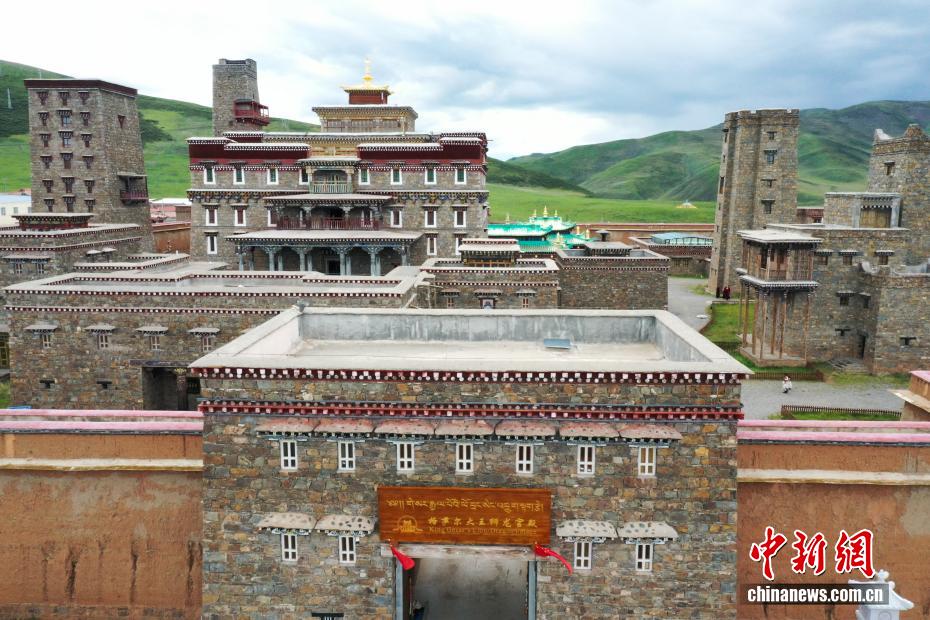8月25日,航拍坐落于青海省果洛藏族自治州达日县境内的格萨尔王狮龙宫殿。宫殿占地面积180平方米,兼具文化传习所、历史民俗博物馆及非遗传承基地功能,被列为青海省格萨尔文化研究基地。(无人机照片)中新社记者 马铭言 摄