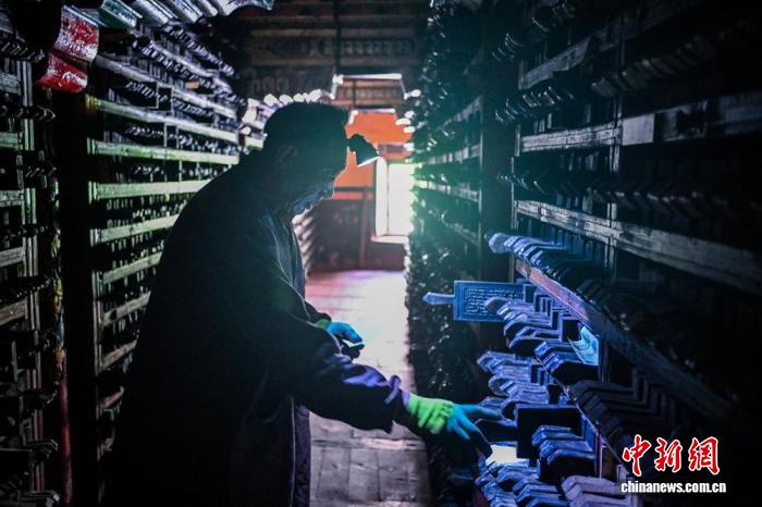 德格印经院藏版库内一名老师傅戴着头灯仔细寻找和核对需要的印版。记者 刘忠俊 摄