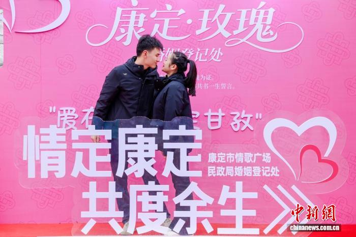 康定情歌广场设立的玫瑰婚姻登记处吸引情侣们合影。康定市文广旅局供图