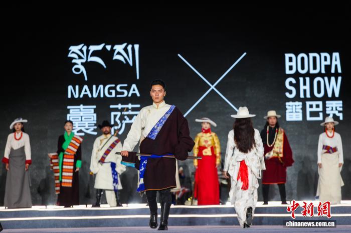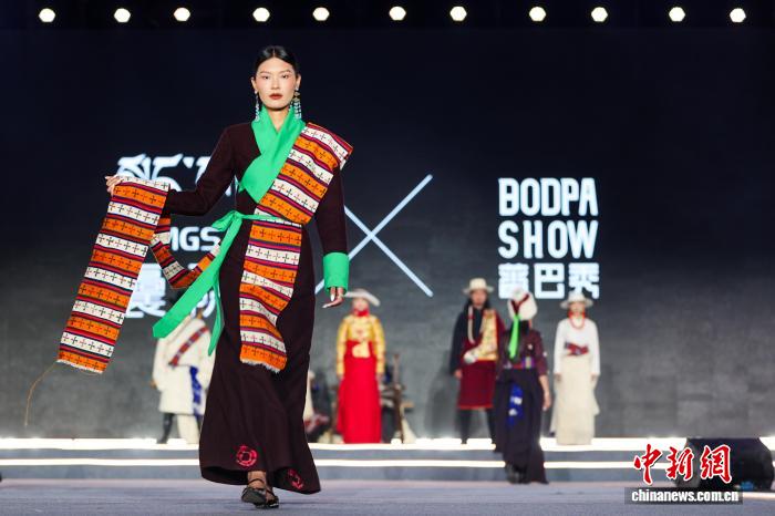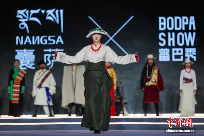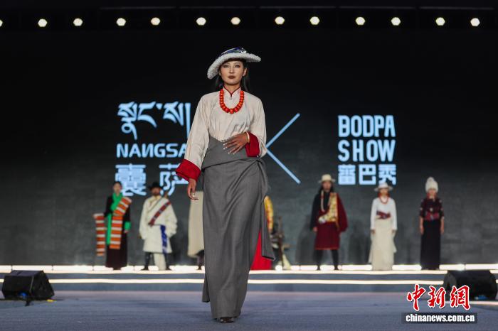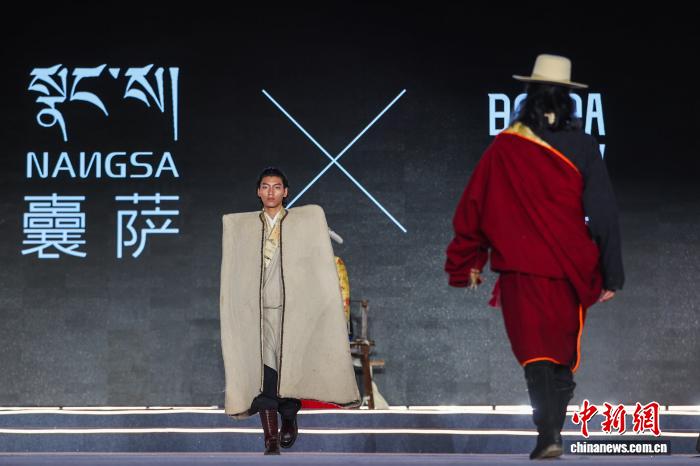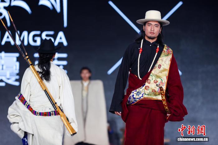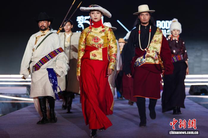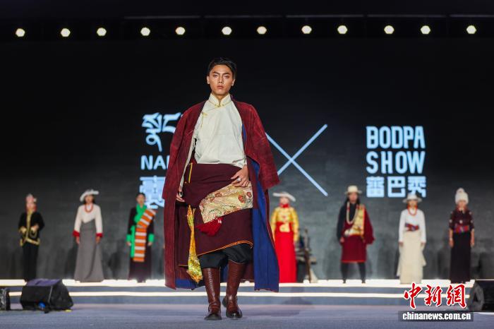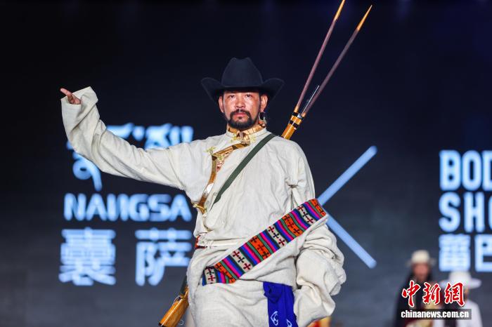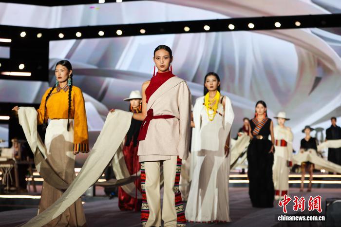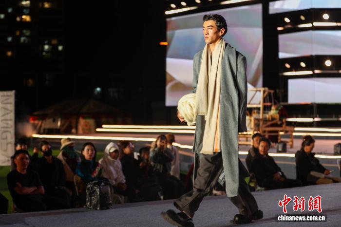 9月7日,青海尖扎,融合传统工艺与现代设计的氆氇服饰秀上演。氆氇是藏族一种古老的羊毛纺织工艺制品,拥有2000多年历史。氆氇生产经洗毛、梳毛、捻线等多道工序后可制成细密平整、质软光滑的藏式服饰。中新社记者 薛蒂 摄