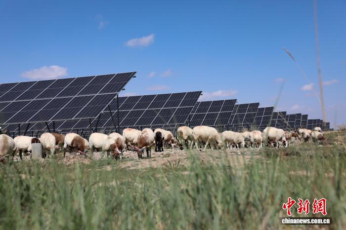 资料图为青海省海南藏族自治州共和县塔拉滩光伏产业园区内,“光伏羊”在光伏板下吃草。马铭言摄