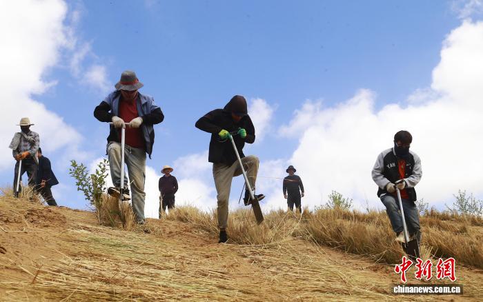 资料图为青海省海南藏族自治州贵南县黄沙头国家沙漠公园内,当地民众参与沙漠治理,铺设草方格。马铭言摄