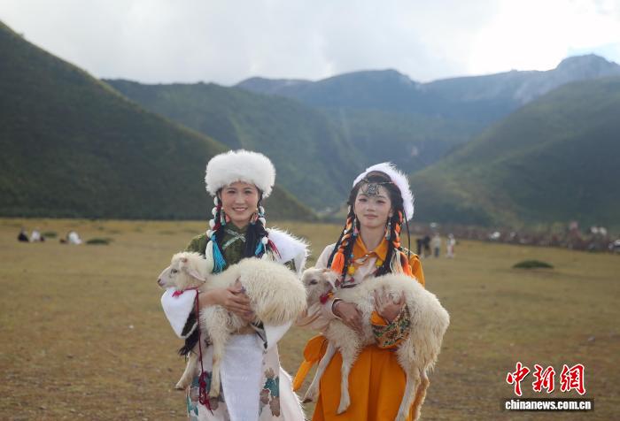 9月28日,两名身穿藏族服装的游客在石卡雪山下与羊羔合影。当日,入秋的云南省迪庆藏族自治州香格里拉市,狼毒变红,树叶变黄,风景如画,吸引各地游客前来观光。中新社记者 黄兴鸿 摄