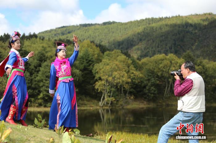 9月28日,游客在普达措国家公园拍照。当日,入秋的云南省迪庆藏族自治州香格里拉市,狼毒变红,树叶变黄,风景如画,吸引各地游客前来观光。中新社记者 黄兴鸿 摄