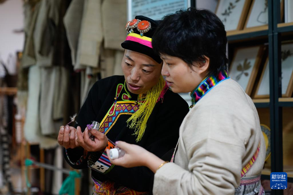 10月7日,能卡曼(左)在工作室里为游客介绍硗碛花腰带编织技艺。新华社记者 胥冰洁 摄