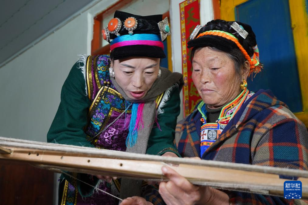 10月7日,能卡曼(左)在工作室带领游客体验牦牛毛纺织技艺流程中的捻线。新华社记者 胥冰洁 摄