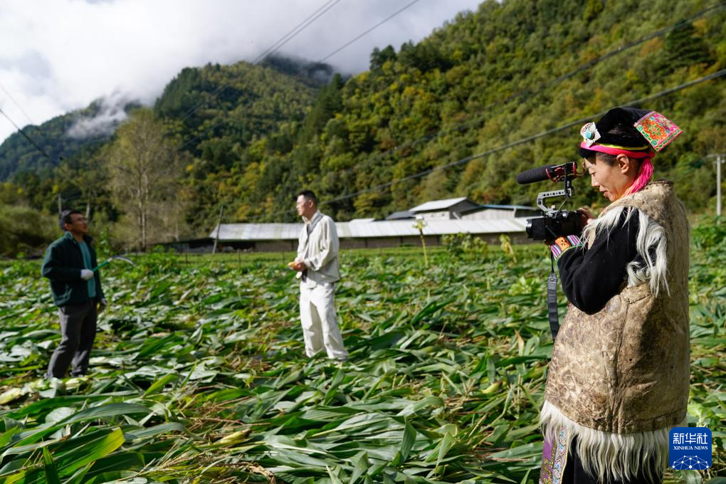 10月8日,能卡曼(右)在四川雅安宝兴县硗碛藏族乡夹金山村的田地里拍摄视频素材。新华社记者 胥冰洁 摄