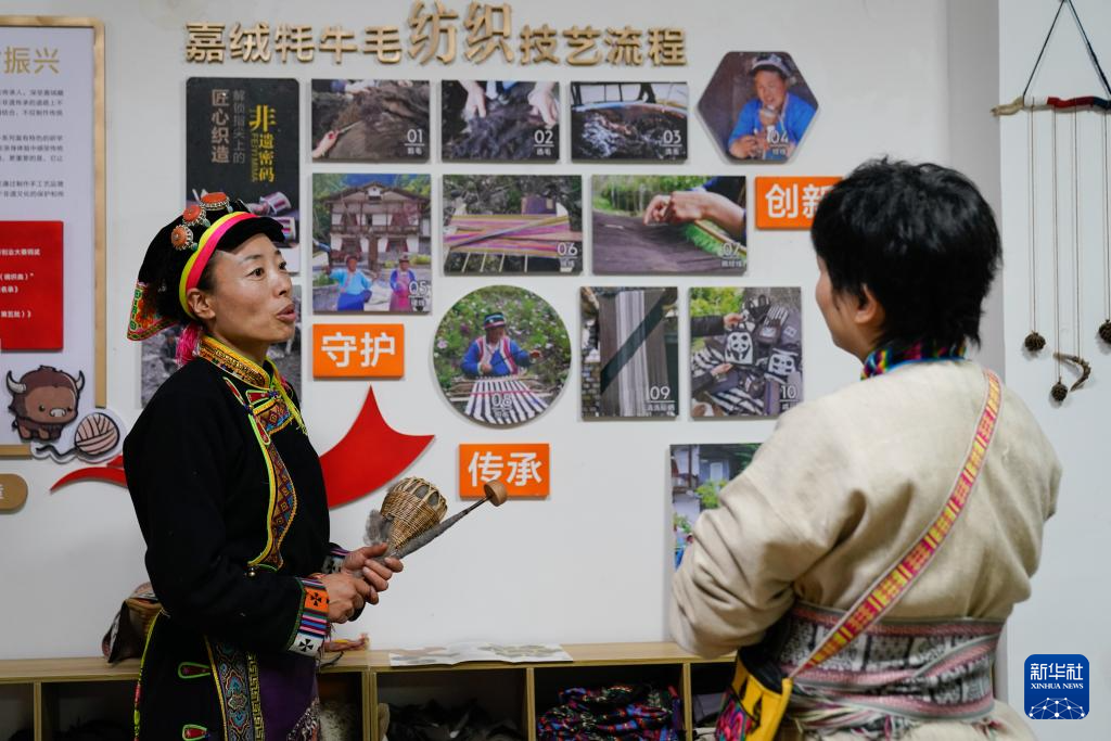 10月7日,能卡曼(左)在工作室为游客介绍牦牛毛纺织技艺流程。新华社记者 胥冰洁 摄