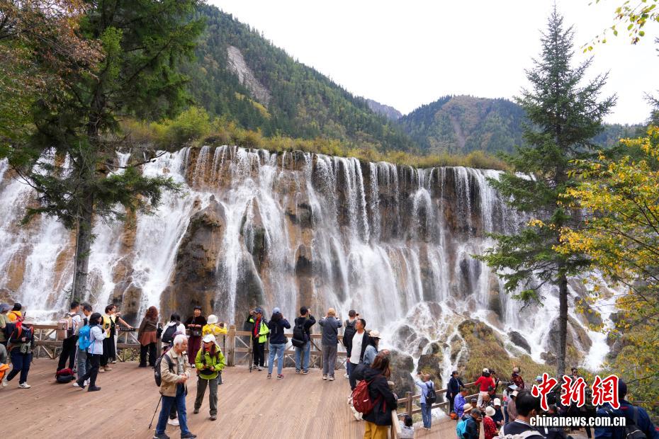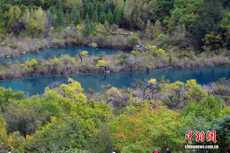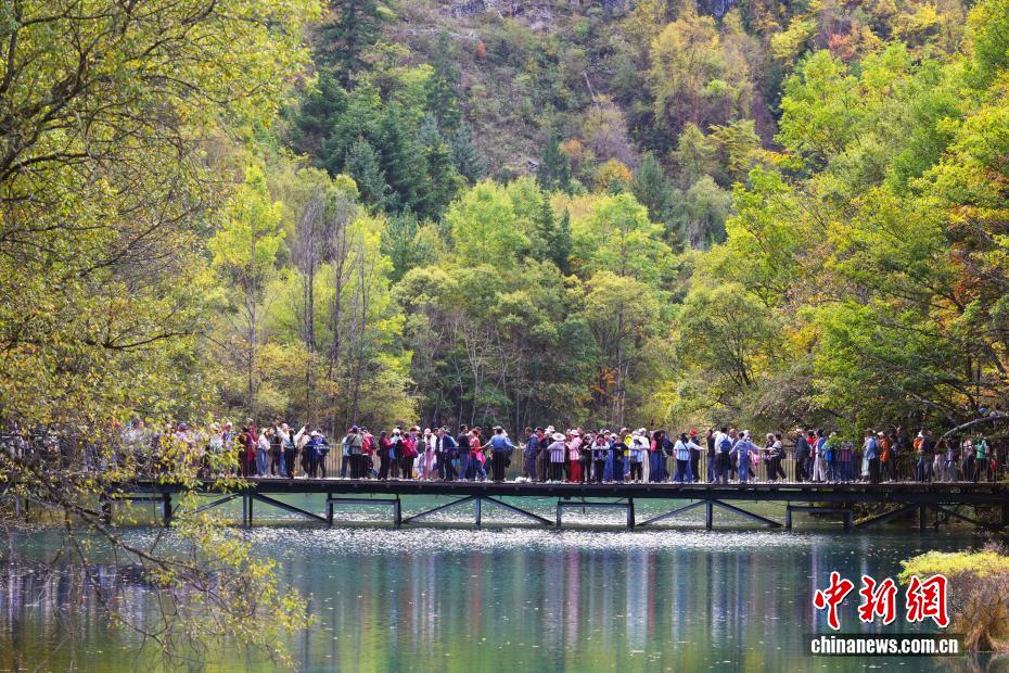 10月13日,世界自然遗产地九寨沟景区秋景如画,吸引众多游客观光游玩。
