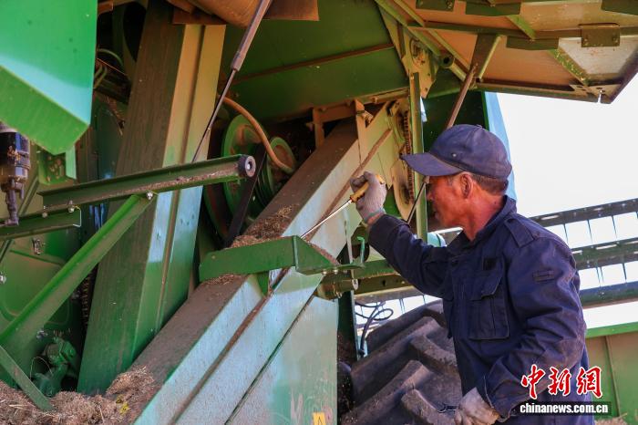 图为农民清理收割机内的麦秆和杂草。中新社记者 薛蒂 摄