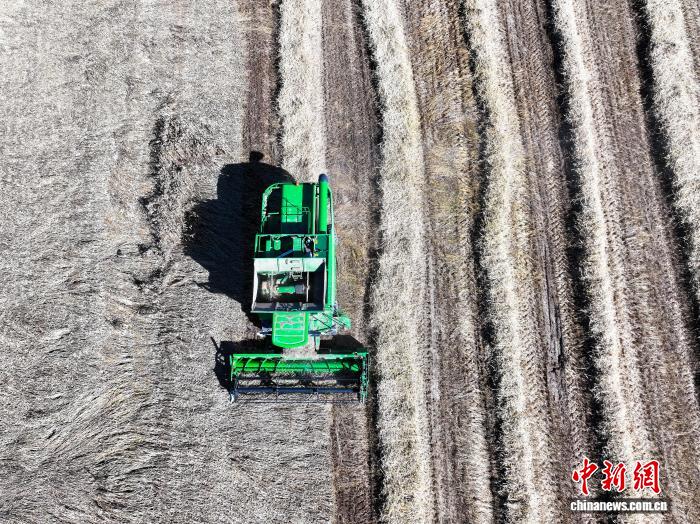 图为小麦收割现场。(无人机照片)中新社记者 薛蒂 摄
