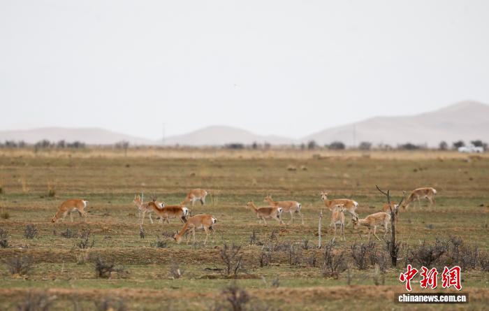 资料图为成群普氏原羚在青海省海北藏族自治州刚察县哈尔盖镇境内的草原上漫步。马铭言 摄