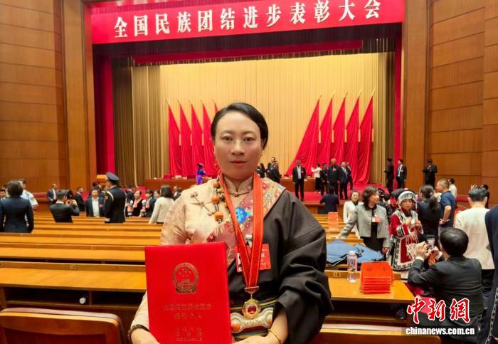 图为尼玛拉毛在2024年全国民族团结进步表彰大会上获“全国民族团结进步模范代表个人”称号。尼玛拉毛供图