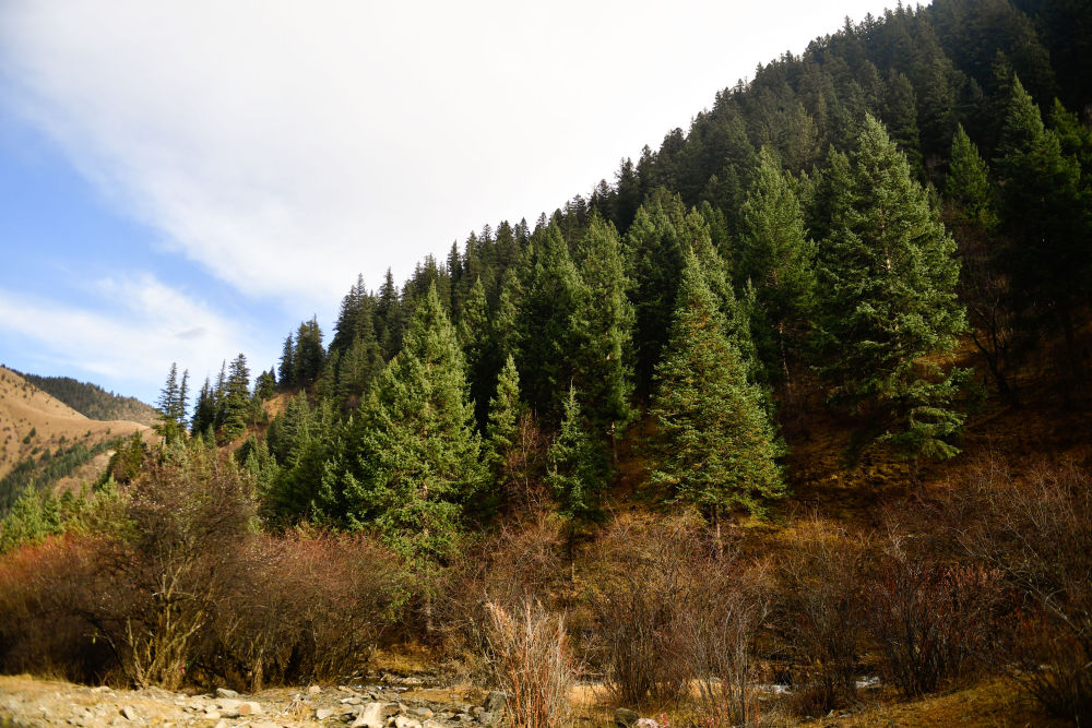 深秋清晨,青海省果洛藏族自治州班玛县境内的玛可河林区空气清冽,青岚氤氲。沿着河谷一路向南,岩羊跳跃的身影不时闪现在山上,为寂静的山林增添不少生气。