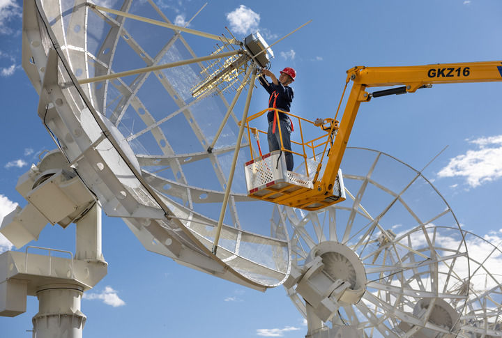 2025年9月19日,工作人员在位于四川省稻城县的子午工程二期圆环阵太阳射电成像望远镜进行设备运维。新华社记者 江宏景 摄