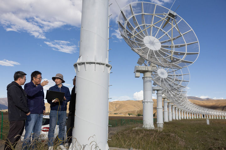 2025年9月19日,中国科学院国家空间科学中心研究员、圆环阵太阳射电成像望远镜主任设计师阎敬业(左二)在位于四川省稻城县的子午工程二期圆环阵太阳射电成像望远镜设备运维现场与工作人员交流。新华社记者 江宏景 摄