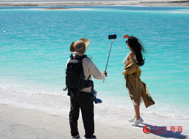 游客在大柴旦翡翠湖拍照。人民网记者 况玉 摄