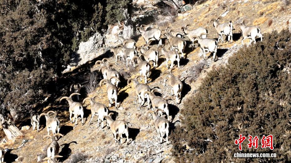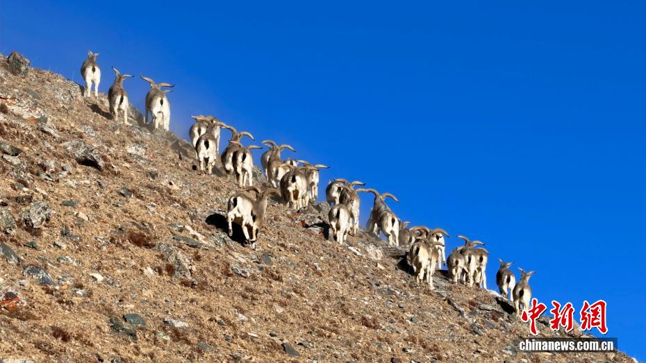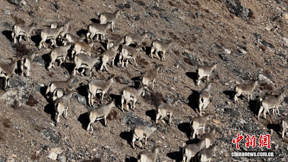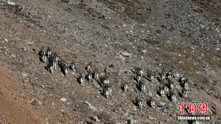 图为岩羊群在山坡上行走。(无人机照片)都尔斯雷 摄