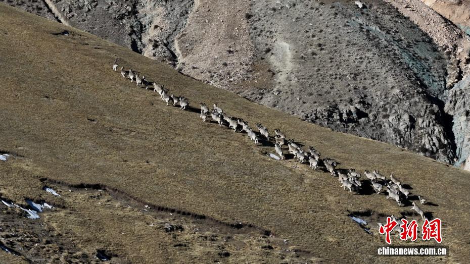 图为岩羊群在山坡上奔跑。(无人机照片)都尔斯雷 摄