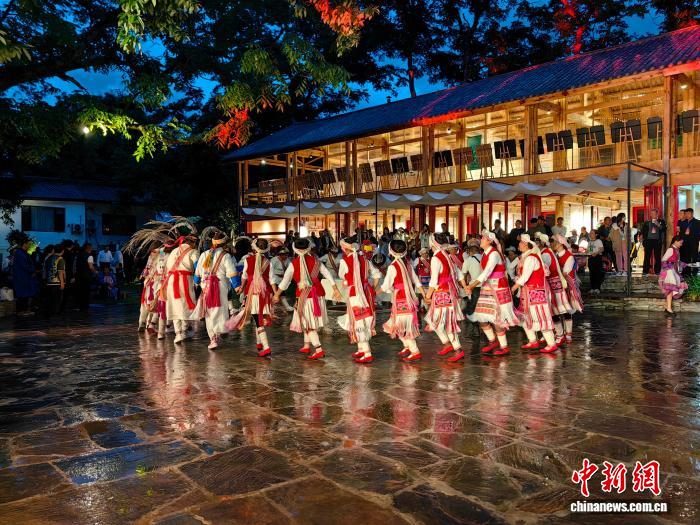 和新海组建的民族歌舞表演队在启别村表演傈僳族舞蹈阿尺木刮。受访者 供图