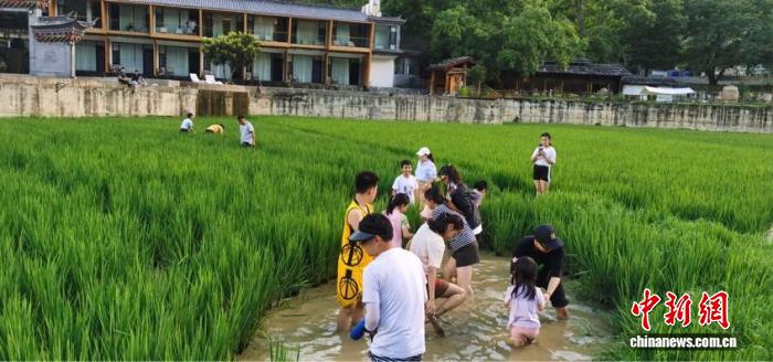 亲子游客在启别村稻田间体验摸鱼。受访者 供图