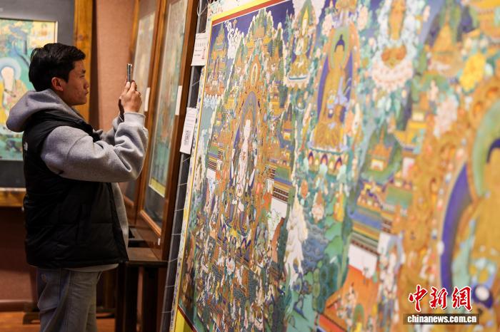 12月10日,青海省黄南藏族自治州同仁市胜境画院内,一名学生观赏唐卡画师夏吾尖措的作品。热贡唐卡源于当地独特的文化生态,被誉为绘画艺术中一面独具韵味的旗帜。如今,许多画师通过系统授徒、开办传习工坊等方式,将调色、勾线、描金等核心技艺传授给年轻一代,让古老技艺得以传承和延续。中新社记者 薛蒂 摄