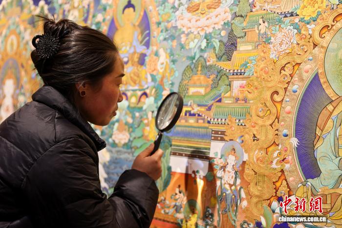 12月10日,青海省黄南藏族自治州同仁市胜境画院内,学生用放大镜观看唐卡画师夏吾尖措的作品。热贡唐卡源于当地独特的文化生态,被誉为绘画艺术中一面独具韵味的旗帜。如今,许多画师通过系统授徒、开办传习工坊等方式,将调色、勾线、描金等核心技艺传授给年轻一代,让古老技艺得以传承和延续。中新社记者 薛蒂 摄