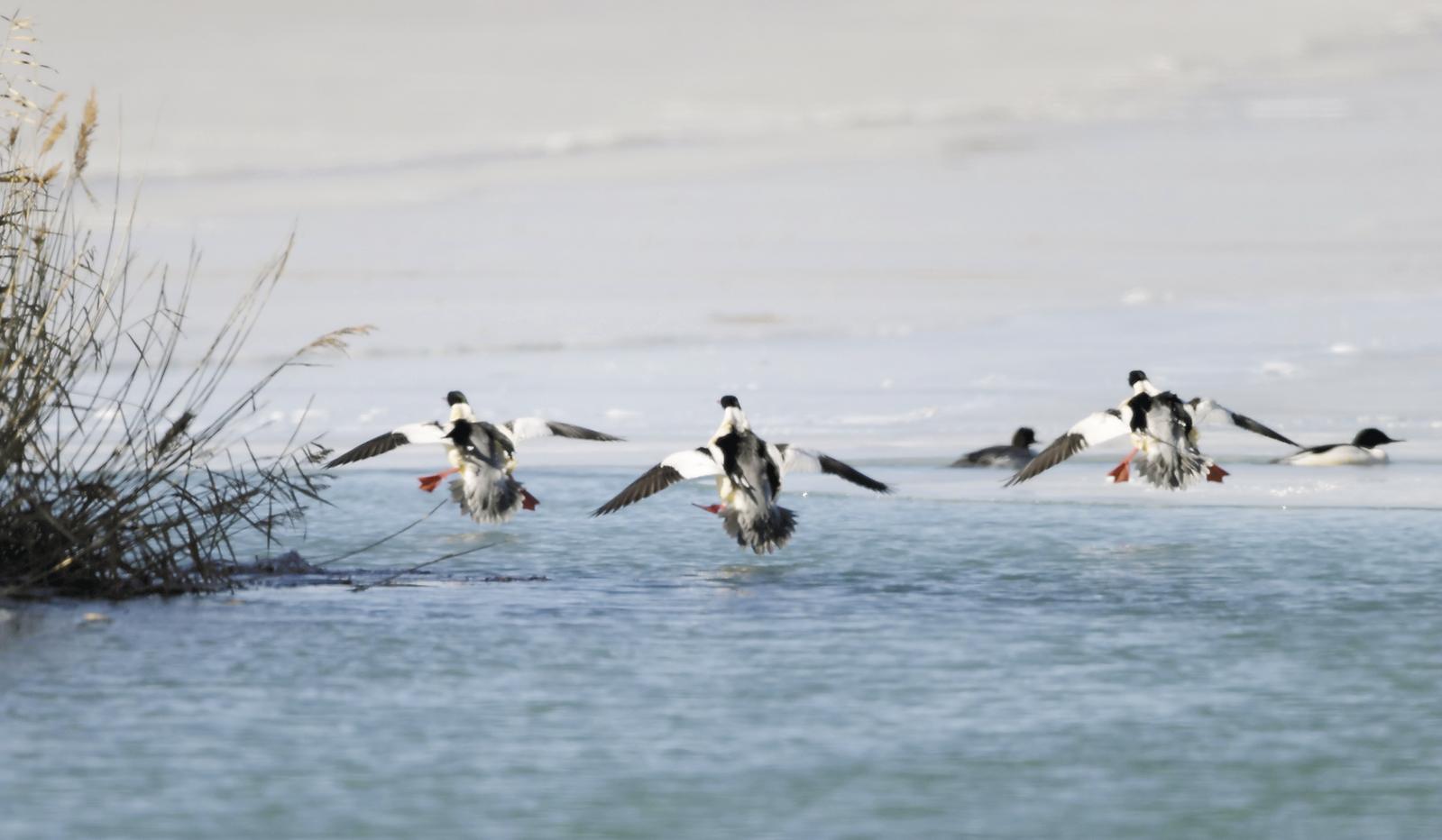返程的路上,一幕场景让所有人都停下了脚步——两只白尾海雕稳稳地蹲在湿地冰面凸起的冰凌上,它们跟前有一汪没结冰的小水池,几只普通秋沙鸭居然就在池里慢悠悠地游着,面对近在咫尺的天敌,竟显得坦然自若。没有追逐,没有惊慌,就这么安静地共享着这片小水域。